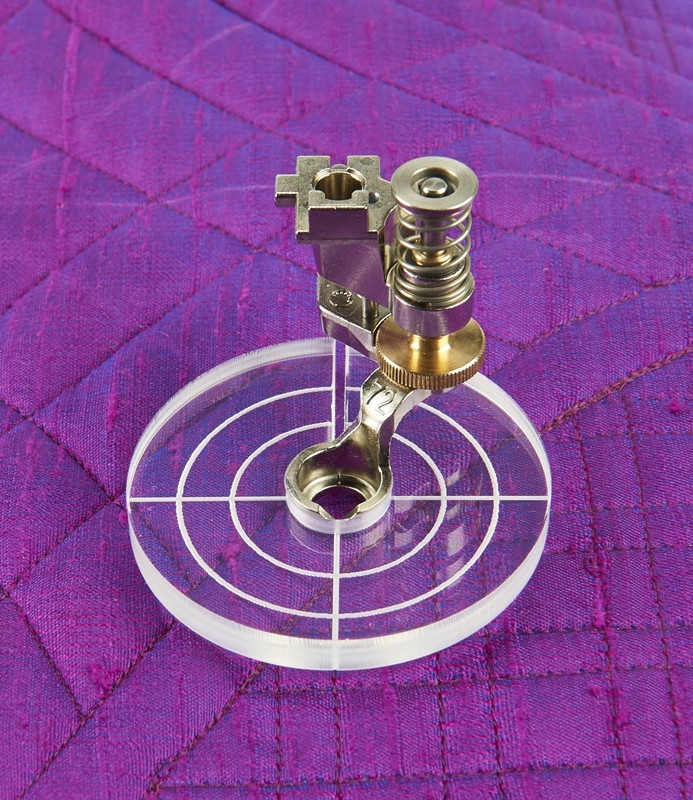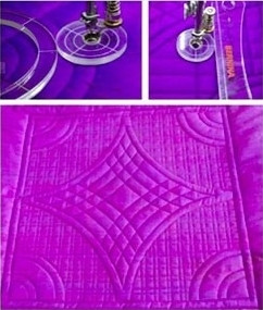 Cuando se trabaja con los clips Eco-Quilt, se cose junto con una regla de plexiglás para crear patrones decorativos de acolchado, tales como líneas, plumas. círculos, etc.