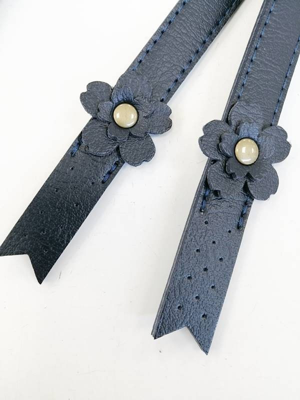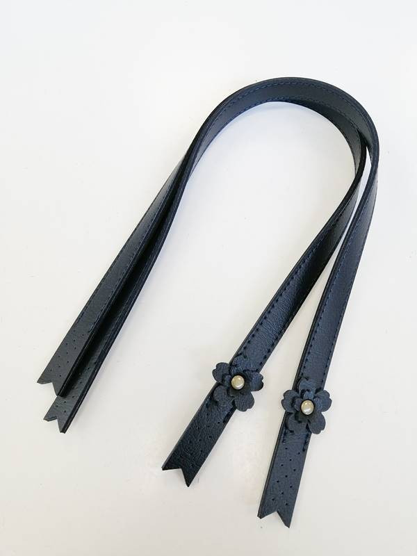 Asas de cuero sintético azul planas con detalle de flor y agujeros para su correcta posición y posterior cosido. Largura 60 cm y anchura 1.5cm