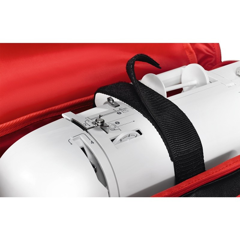 El volumen impresionantemente grande de esta bolsa de máquina de coser le permite acomodar cualquier máquina de coser doméstica sin esfuerzo. Ya sea para almacenar su máquina de coser o llevarla a la clase de costura, se puede guardar completamente con todos sus accesorios y, por lo tanto, está protegida del polvo. Los accesorios de costura se almacenan en el compartimento exterior grande y plano y el bolsillo pequeño en la parte delantera. La máquina de coser está asegurada firmemente en su lugar por una correa de retención con cierre de gancho y bucle en el compartimento interior forrado. Las resistentes correas para los hombros garantizan un transporte cómodo y cómodo de la máquina de coser. También es posible colocar la bolsa de la máquina de coser cómodamente en el carro de la máquina de coser, si desea transportar una segunda máquina de coser o tela adicional necesaria para su proyecto.