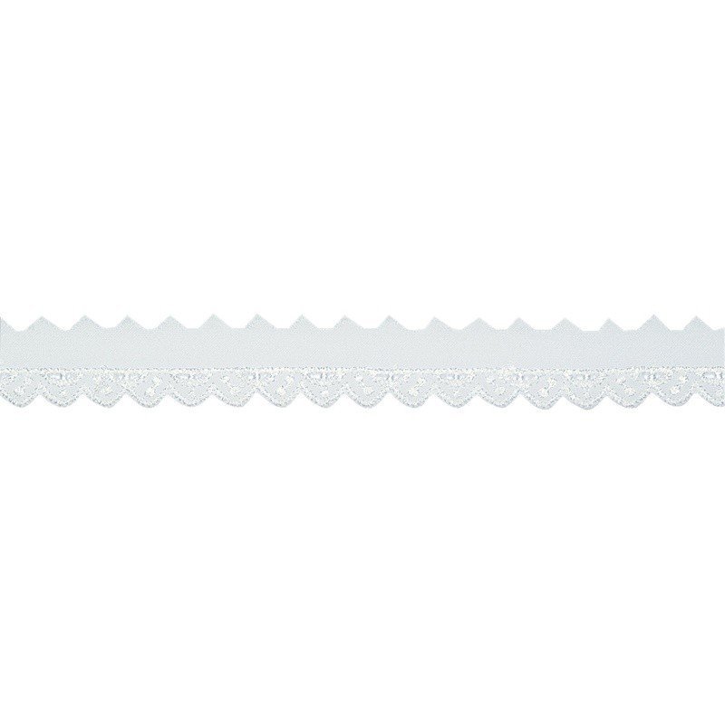El encaje festoneado blanco mejora convincentemente los bordes de la ropa de cama fina, la ropa de mesa, los delantales, la ropa interior o los camisones. Con la ayuda de la puntada de ojal, aqui se bordaron varios patrones en curso, ya sea como ondas bien formadas o triangulos clasicos. Los agujeros en forma de lagrima estan finamente bordados. El encaje festoneado esta hecho de 80% de algodon, por lo que se puede lavar a 60 grados. El encaje festoneado en blanco y ondas esta disponible desde 18 mm hasta 35 mm de ancho y en triangulos blancos de 20 mm de ancho.