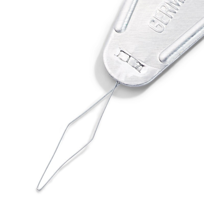 Los enhebradores de aguja de aluminio y el acero para resortes son un clásico entre los enhebradores, que todos saben por la caja de costura de su abuela. Con su lazo fino hecho de alambre de acero de resorte flexible, es ideal para hilo fino y agujas de coser a mano con un ojo pequeño. La plaqueta de aluminio tiene un grabado nostálgico y se utiliza como agarre al enhebrar. Al enhebrar con un ojo grande, el enhebrador de aguja también puede enhebrar hilo grueso o lana, siempre que no se use fuerza para enhebrar. Esto lo ha convertido en una ayuda popular en la estación de costura profesional y doméstica durante cuatro décadas.