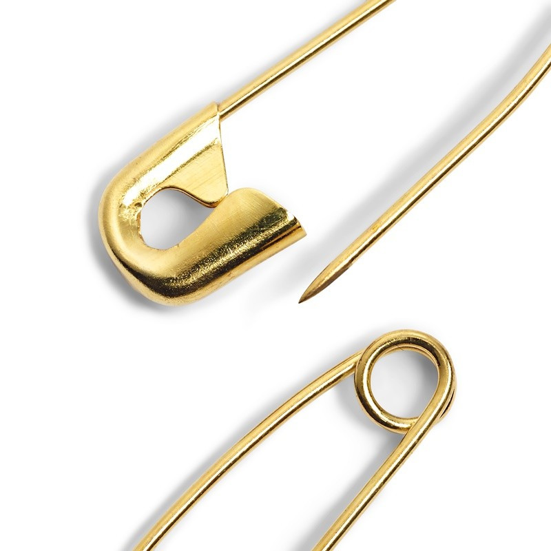 Los pasadores de seguridad de latón curvos son particularmente adecuados para proyectos de colcha y remiendo. Son extremadamente resistentes al óxido y, por lo tanto, pueden permanecer en la pieza de trabajo durante más tiempo también. Su forma curva le permite perforar y pegar fácilmente varias capas de tela. Los pasadores también tienen un alto nivel de fuerza de sujeción cuando se abren y cierran con frecuencia, ya que el latón utilizado tiene una fuerza de resorte equilibrada. Prym proporciona los pines de oro en tamaños de 27 mm y 38 mm.