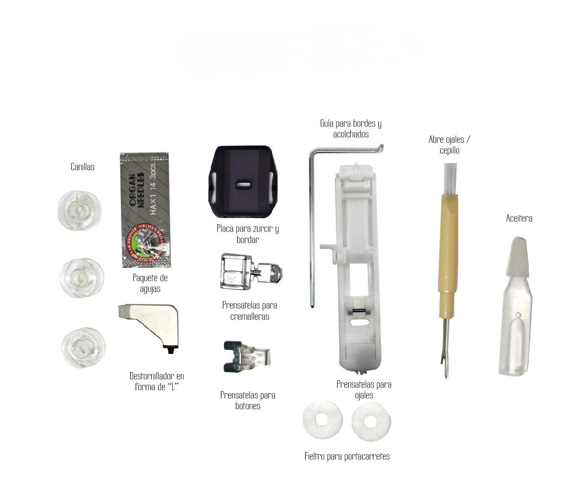 - 34 tipos de puntadas (básicas, decorativas y elásticas)