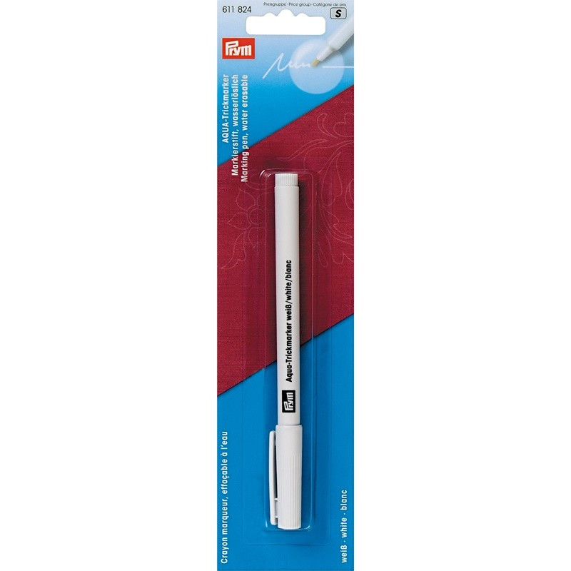 El rotulador borrable con agua de Prym es especialmente útil para el trazado de marcas, que no deben ser visibles, una vez que el mosaico, el acolchado, la costura o el bordado hayan finalizado. El marcador de truco es un rotulador borrable con agua, disponible en blanco o turquesa; debe almacenarse verticalmente, con la tapa hacia abajo, para evitar que se seque. Disponible en dos espesores de cartucho, le permite trazar líneas finas o gruesas sin dificultad en telas claras y oscuras. El marcador Aqua truco con trazo extra fino solo está disponible en turquesa. Todas las marcas se pueden quitar de la tela con un trapo húmedo o usando el marcador de agua de Prym. Importante: antes de usar el rotulador, utilícelo para marcar una pieza de prueba de tela y luego pruebe la eliminación de las marcas de esa pieza de tela.