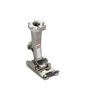 Las ranuras permiten coser homogéneamente hilos colocados unos al lado de otro o cintas estrechas que se mantienen exactamente en su lugar gracias a la lengüeta. Con ello no es necesario guiar el hilo. El pie #22 está diseñado para 3 hilos simultáneos.