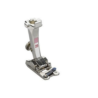 Las ranuras permiten coser homogéneamente hilos colocados unos al lado de otro o cintas estrechas que se mantienen exactamente en su lugar gracias a la lengüeta. Con ello no es necesario guiar el hilo. El pie #25 está diseñado para 5 hilos simultáneos.