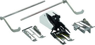 El prensatelas de doble arrastre ayuda al transporte de la tela. Es especialmente adecuado para máquinas de acolchado de líneas rectas y para coser de forma precisa materiales de difícil deslizamiento o elásticos, que tienden a desviarse o que no se pueden estirar con facilidad. Sus dos guías para bordes ayudan a lograr un trabajo preciso.