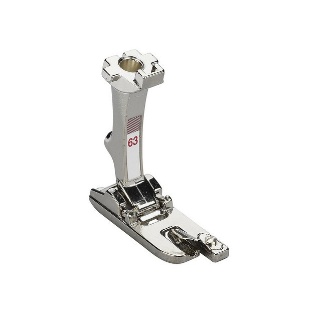 En una fase de trabajo, el prensatelas dobladillador para puntada en zigzag cose bonitos dobladillos que no se deshilachan. La tela se enrolla dos veces y se cose fijamente con una puntada en zigzag o decorativa. El pie #63 es apto para telas finas.