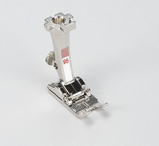 Este prensatelas se construyó especialmente para los embudos ribeteadores de bies #87 y #88. Gracias a su hueco lateral se puede colocar cerca del embudo ribeteador de bies, lo cual facilita la labor.