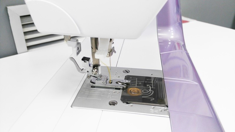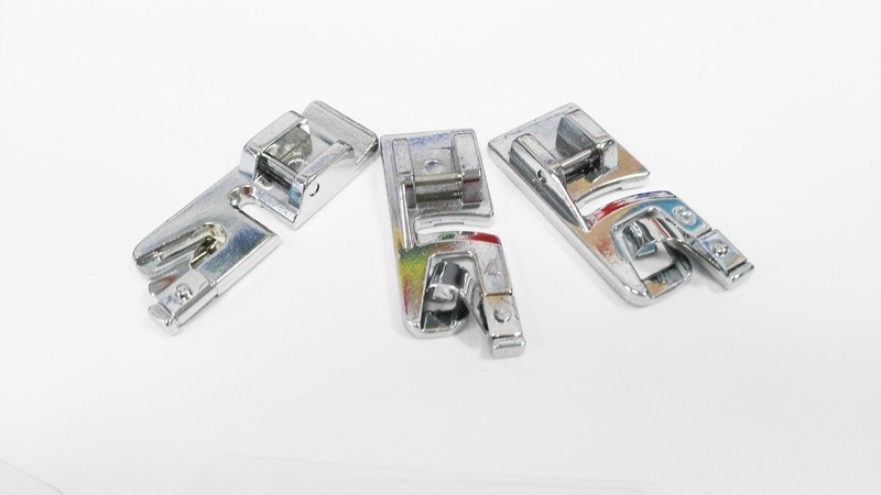 Este prensatelas sirve para crear dobladillos profesionales. Dobla el tejido dos veces y seguidamente lo fija la aguja con un punto recto. El resultado es un dobladillo redondo perfecto.