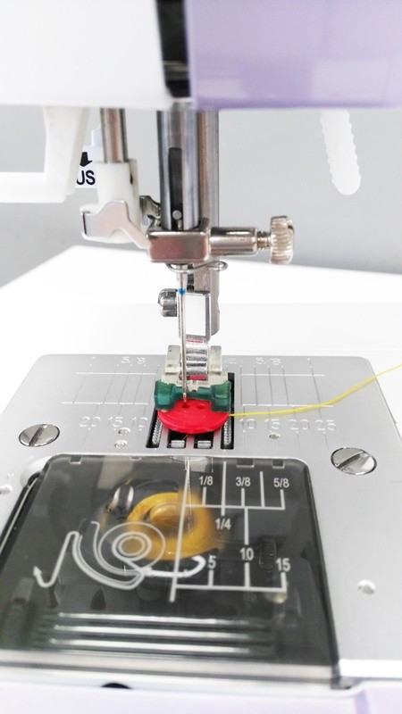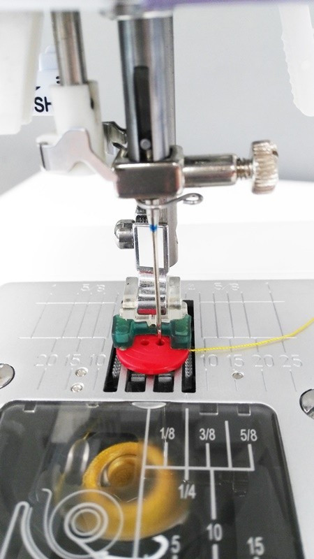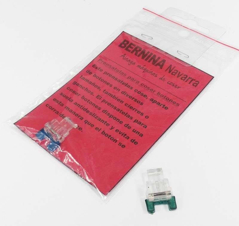 Este prensatelas cose, aparte de botones en diversos tamaños, también cierres o ganchos. El prensatelas para coser botones dispone de una