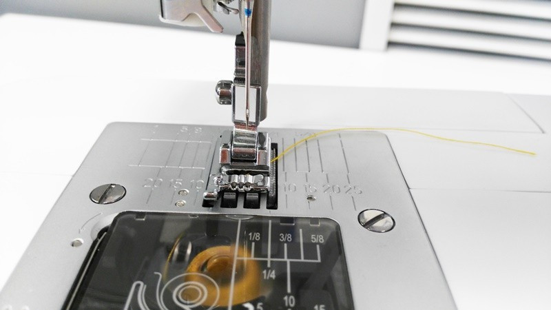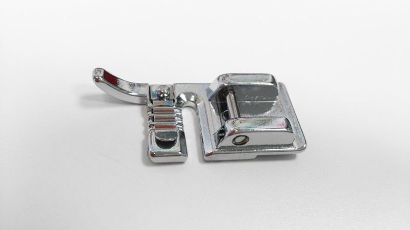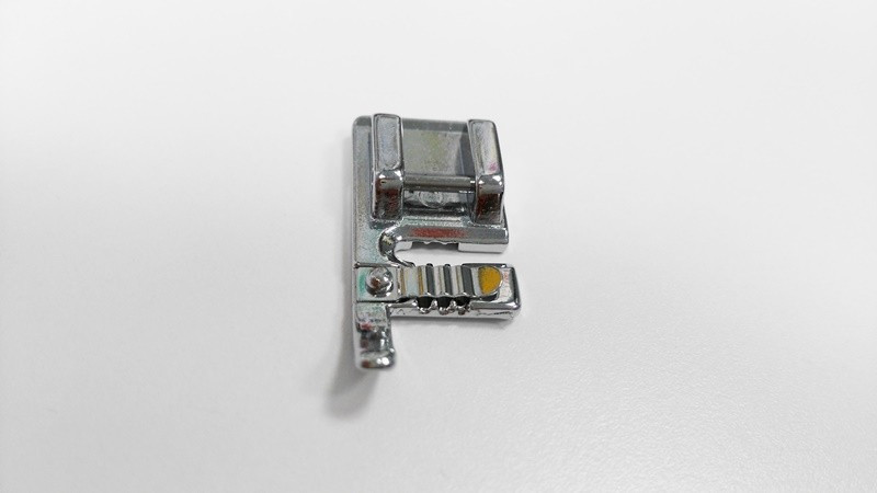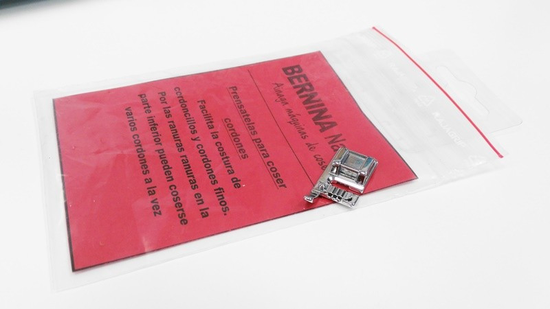 Facilita la costura de cordoncillos y cordones finos. Por las ranuras en la parte inferior pueden coserse hasta tres cordones a la vez.