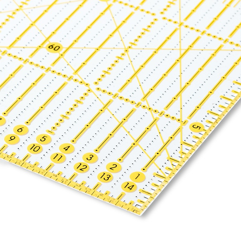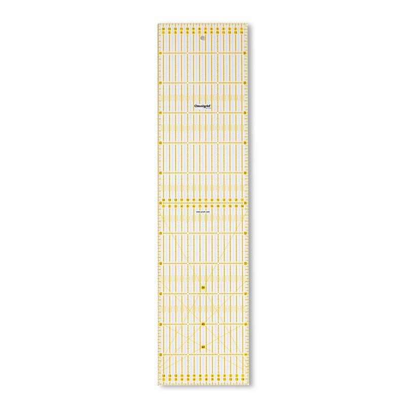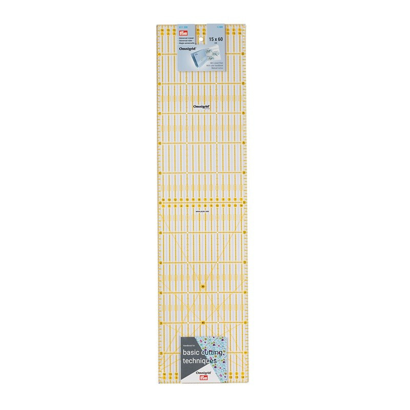 Ya sea en la mesa de corte o en la máquina de coser: las reglas universales Omnigrid de Prym son compañeras indispensables para patchwork, corte y confección, o para trabajos gráficos. Las marcas de cuadrícula amarillas y negras en una escala métrica o en pulgadas permiten marcar con precisión en telas oscuras y claras. La impresión láser resistente a los arañazos en la parte inferior de la regla evita la distorsión visual. El material grueso, resistente y duradero garantiza un guiado seguro de las cuchillas giratorias y las cuchillas artísticas en la estera de corte. Algunas versiones de las reglas Omnigrid también tienen marcas de ángulo de 30, 45 y 60 grados para cortar triángulos, diamantes y tiras en el sesgo. Para mantener las cosas ordenadas, se puede colgar por el ojal.