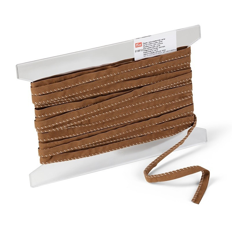 Se ve como el cuero y se siente asi tambien: la tuberia de imitacion de gamuza es la eleccion correcta cuando se trata de bordes originales. Tambien cosida en el escote, la tuberia en color marron es puesta en escena efectivamente. Una puntada uniforme en el borde de la tuberia en un color brillante y de alto contraste completa el efecto especial de la tuberia de manera convincente.