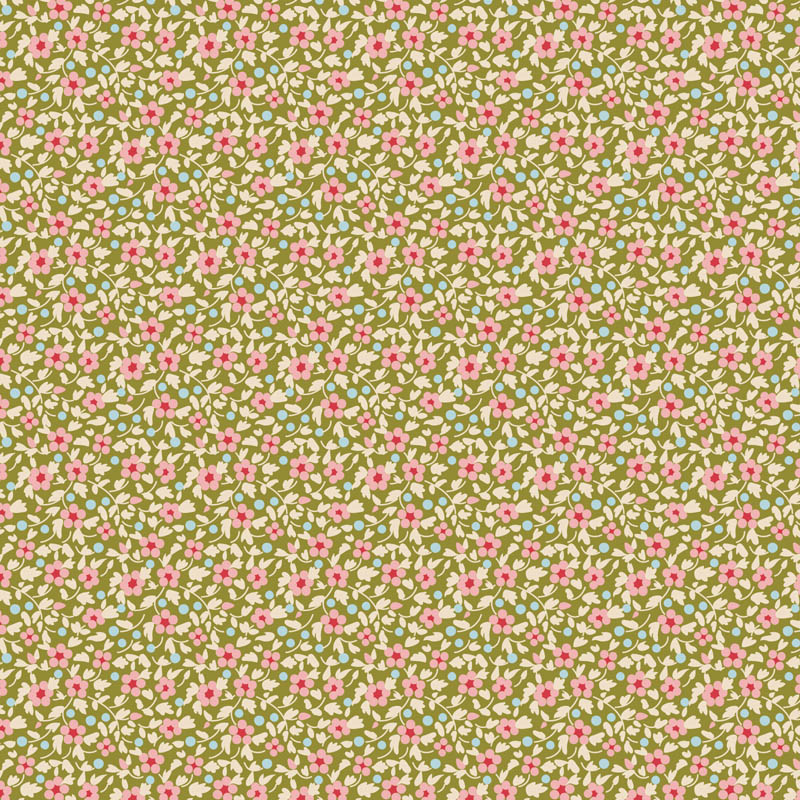Tela Tilda Brie Green con estampado floral en tonos verdes. Ideal para patchwork, costura creativa y proyectos decorativos. Precio por 25 cm de tela.