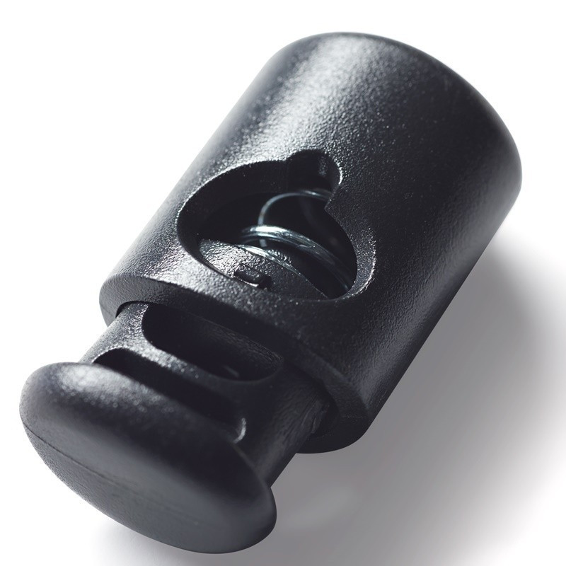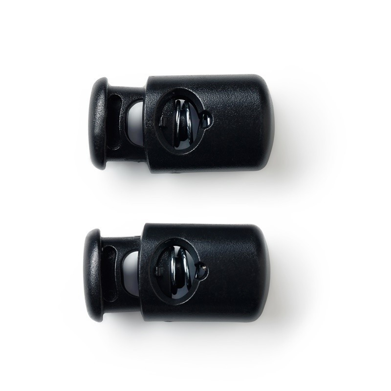 Con estos topes de cordón de plástico de 1 orificio, los cordones de las chaquetas, pantalones o bolsas de gimnasia se pueden asegurar directamente en la abertura de la caja con cordón o ajustarse en longitud. De esta manera, evitan que los cables se deslicen, sirven como un cierre confiable y mejoran visualmente la ropa y las bolsas. Estos topes de cable están disponibles en plástico negro o transparente con 2 unidades cada uno por tarjeta de autoservicio. Son lavables hasta 40 grados.