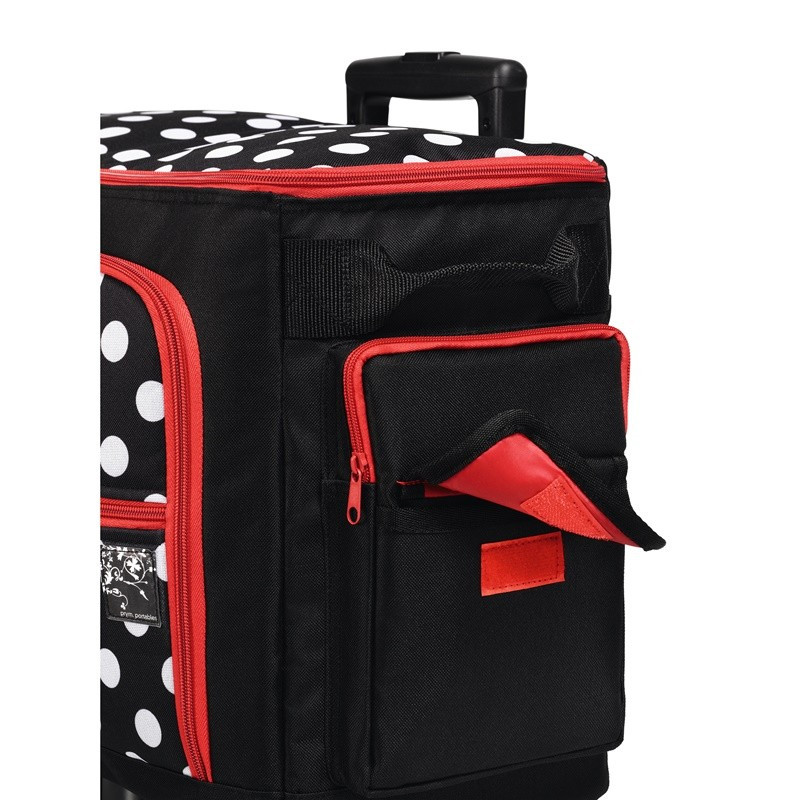 Este carro espacioso asegura que cada máquina de coser doméstica sea transportada de manera segura a la clase de costura. La máquina de coser puede guardarse completamente en el carro y está protegida contra el polvo y daños. Dos bolsillos exteriores a los lados del carro ofrecen espacio para todo tipo de accesorios. Un compartimento exterior grande y plano tiene un cierre de cremallera para facilitar la apertura y se puede doblar para revelar dos compartimentos y tres soportes para reglas, equipos de rastreo y otras herramientas. Un bolsillo exterior adicional proporciona espacio para los pequeños trozos y piezas. El espacio interior está forrado en rojo y un cordón con cierre de gancho y bucle sostiene la máquina de coser de forma segura en su lugar. Una base firme, dos rodillos anchos y patas de plástico proporcionan la combinación ideal de transporte y una posición estacionaria segura. Para moverse con el carro de la máquina de coser,